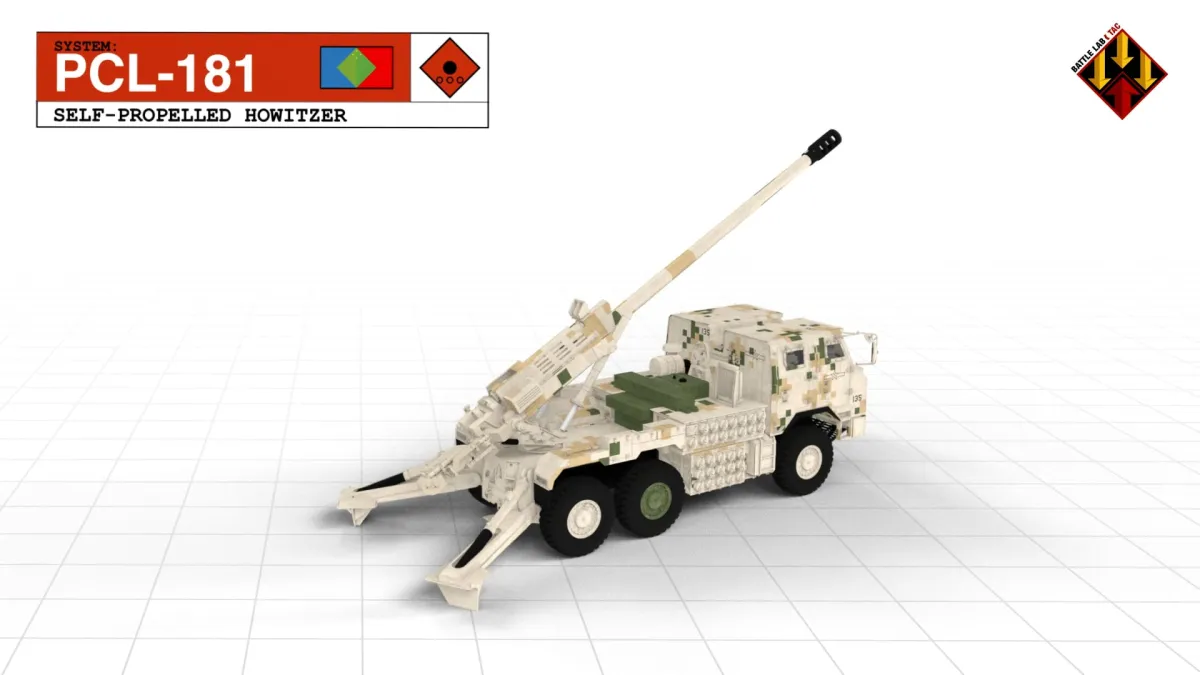 Breadcrumb Home Equipment PCL-181 SPH PCL-181 Main Weapon 155mm Self-Propelled Howitzer Basic Load Description Carries 30 rounds and 30 charges in racks behind the cab Max Range 50KM Crew 6