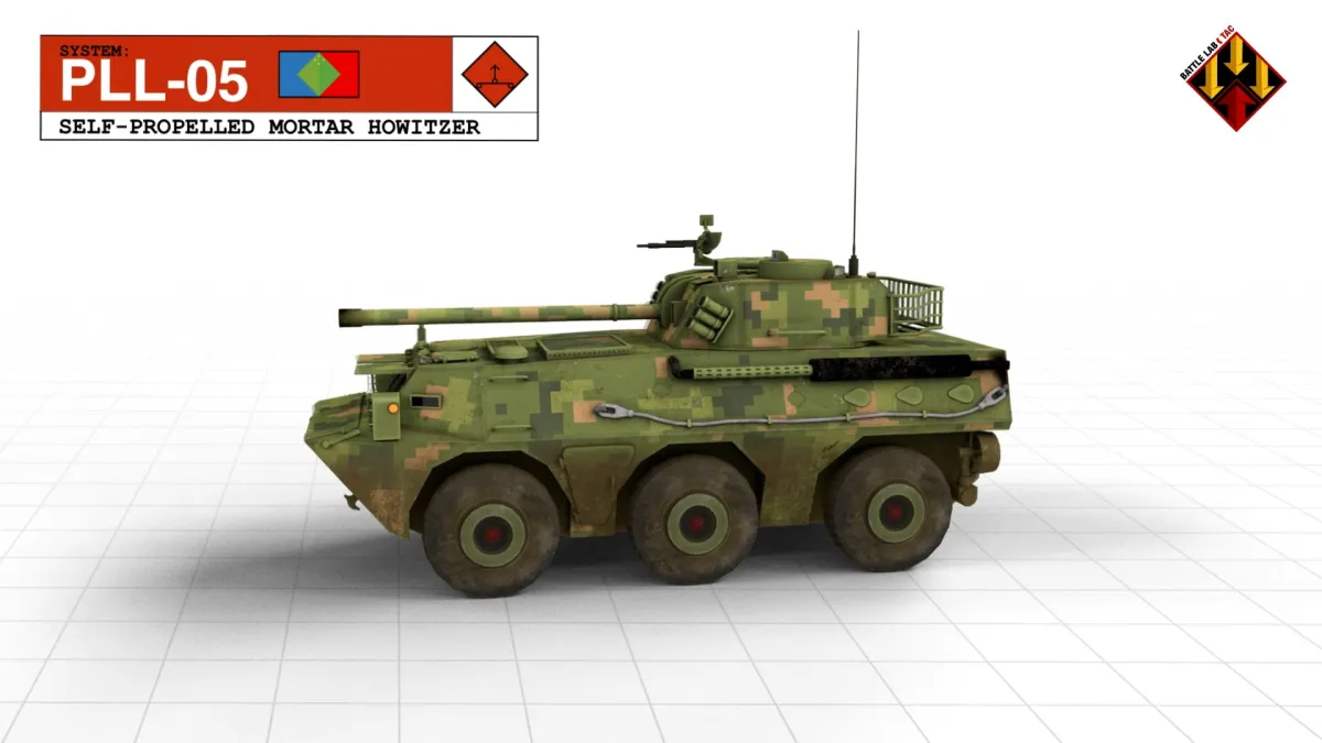 Breadcrumb Home Equipment PLL-05 SPH PLL-05 Main Weapon 120mm SP Mortar Howitzer Auxiliary Weapon 12.7mm Heavy Machine Gun Max Range 9.5KM HE, 13.5 RAP Crew 4